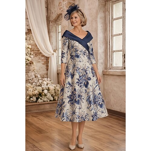 Linea ad A Lunghezza Tè Vestito da Festa Abito da Cocktail Abito da invitata a nozze Abito da cerimonia per signora Manica 3/4 Scollo a V Elegante Formale Serata Formale Ricevimento di matrimonio