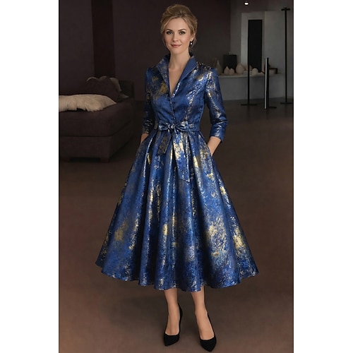 Linea ad A Lunghezza Tè Abito Camicia Abito Formale Abito da sera Abito da cerimonia per signora Manica 3/4 Colletto a Camicia Elegante Vintage Formale Jacquard con Fascia / Nastro Fiocco/Fiocchi