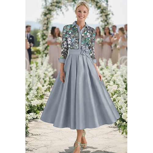 Linea ad A Lunghezza Tè Abito Camicia Abito da sera Abito da cerimonia per signora Manica 3/4 Colletto a Camicia Elegante Vintage Formale Ospite di nozze Derby del Kentucky Raso con Stampa floreale