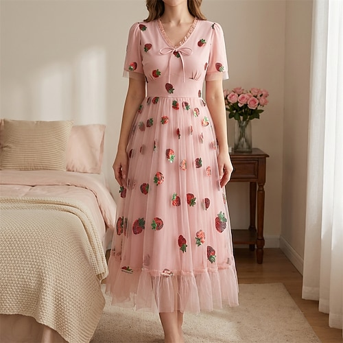 Elegante Vintage Anni 1950 Midi Vestito Maniche corte Ricamato Fragola Linea ad A Aderente Svasato Scollo a V Costume Per donna San Valentino Casuale Festa serale Tè Adulti Vestito Primavera
