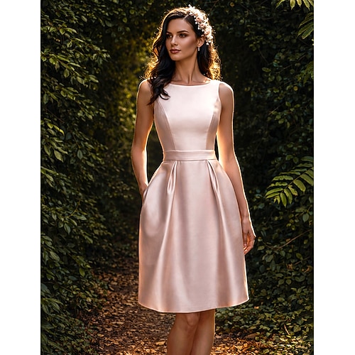 Linea ad A Corto Mini Abiti da Ballo Festa Minimalista Senza Maniche Scollo a Barca Ospite di nozze Laurea Vestito Rosa Raso Schiena a V con Pieghe