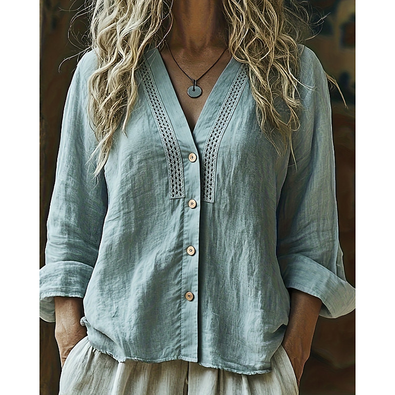 Women's Shirt Blouse Plain Bohemia Casual Long Sleeve V Neck Regular Tops Daily Holiday Buttons Blue Gray Summer Spring