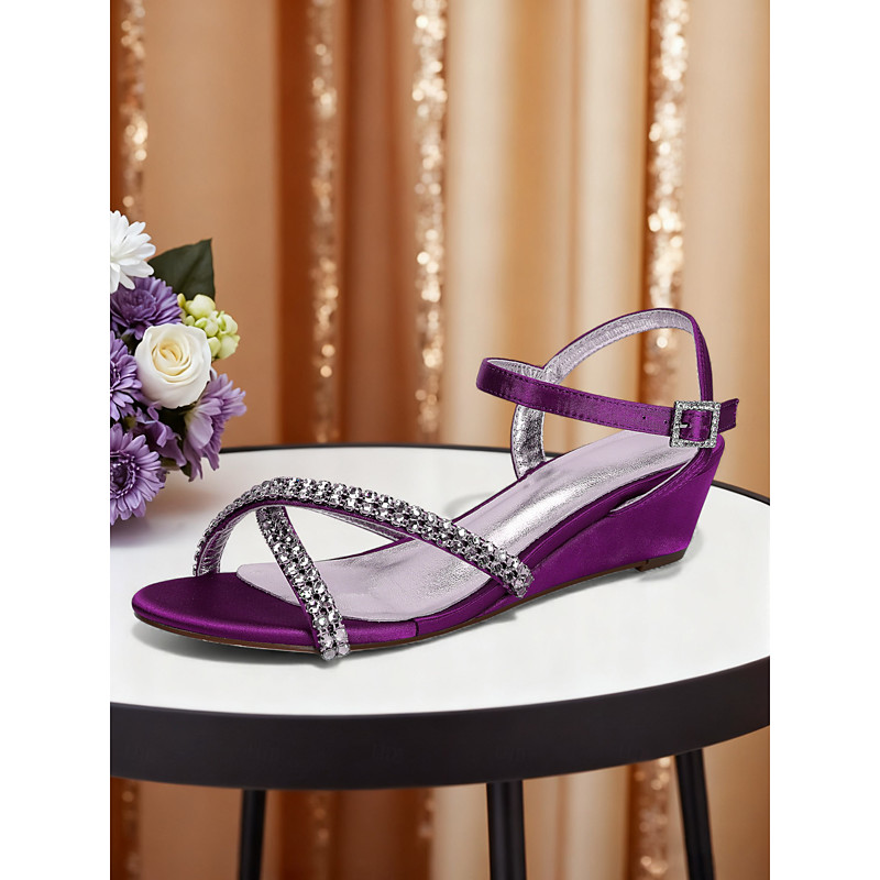 Women's Blue Rhinestone Wedge Sandals - Elegant Open Toe Ankle Strap Heels for Party and Evening Events