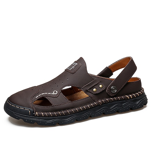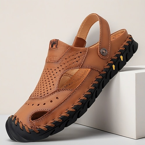 sandali da uomo in similpelle marrone con punta chiusa, design traspirante e traforato con suola antiscivolo, ideali per passeggiate estive, all'aperto e per uso casual