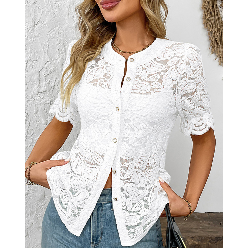 Women's Elegant Lace Tops Eyelet Blouse Lace Work Stylish Modern Short Sleeve Romantic Petite Tops Summer Holiday Wear Black Summer Spring Semi Formal Blouses