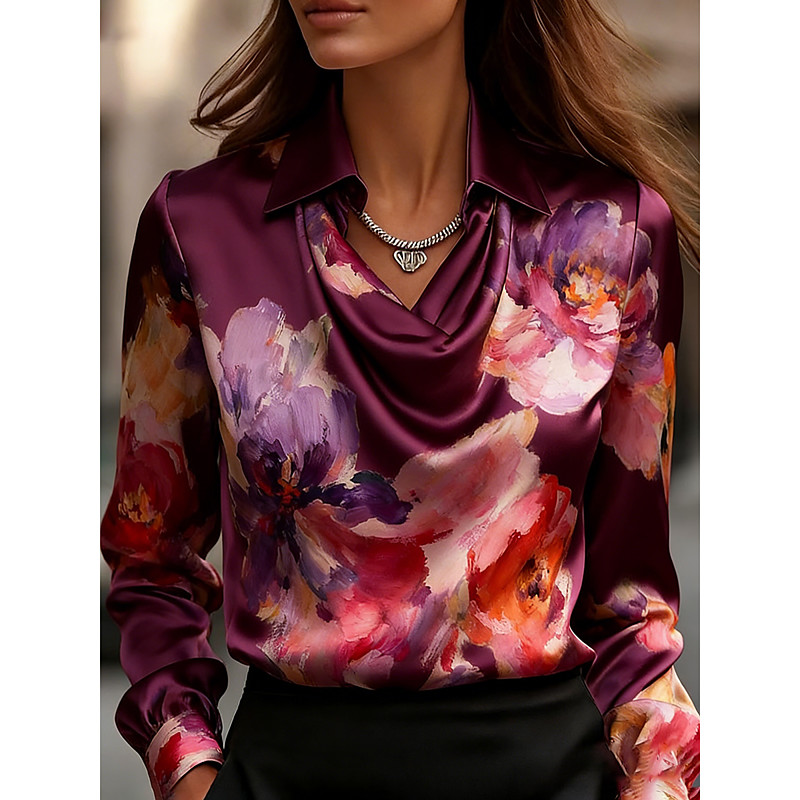 Women's Shirt Satin Floral Elegant Dressy Tops Stylish Casual Long Sleeve Cowl Neck Regular Tops Work Daily Holiday Print Draped Pink Spring Fall