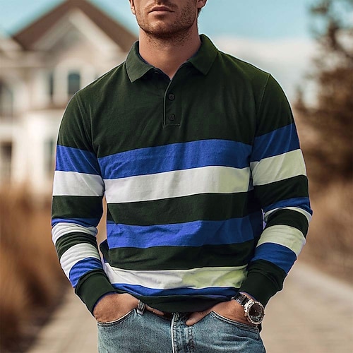 Herren Horizontale Streifen Rugby-Poloshirt Langarm Polo-Shirts Hemden mit Kragen Lässig Outdoor Athleisure 3D-Druck Frühling Herbst Blau Rote Braun
