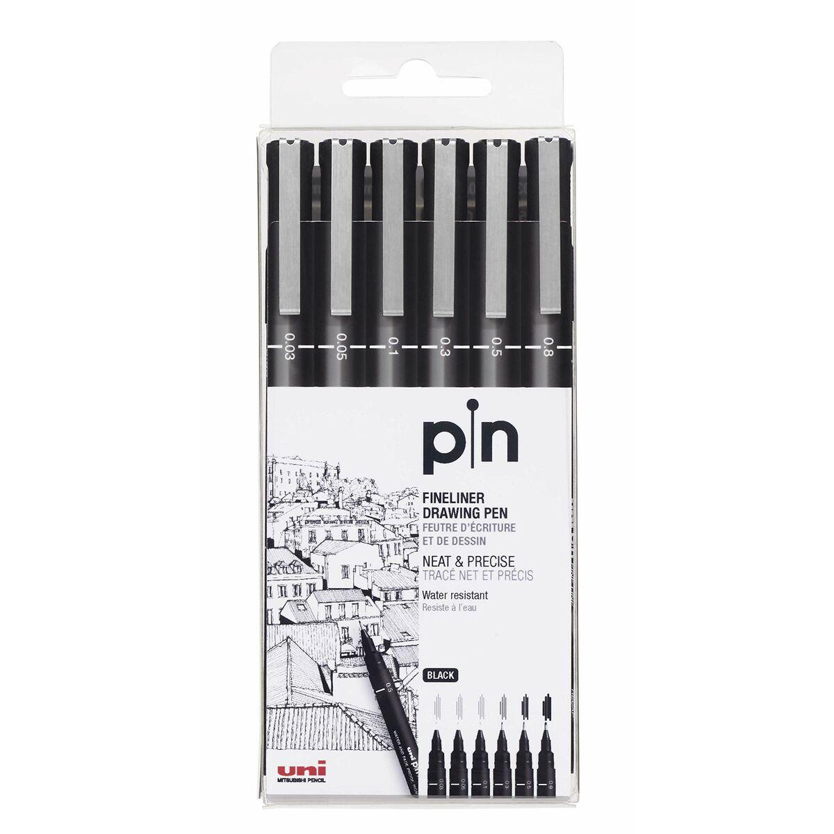 Uni-Ball PIN-200(S) fiberspidspenne - sort/multifarvet, 6 stk.