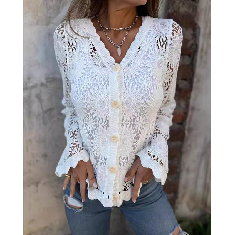 Women's Blouse Lace Tops Plain Active Casual Long Sleeve V Neck Regular Tops Daily Holiday Going out Lace Patchwork Buttons Black White Apricot Spring Fall