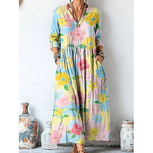 Per donna Abito Midi Abito a Tubino Casual Data Vestibilità comoda Floreale Grafico Manica Lunga Scollo a V Giallo Rosa Viola Estate Primavera