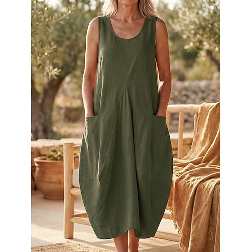 Per donna Abito lungo maxi Finto cotone e lino Abito a Tubino Vestito Casual Quotidiano Essenziale Casual Quotidiano Casa Spiaggia Vestibilità comoda Semplice Manica Corta Girocollo Verde militare