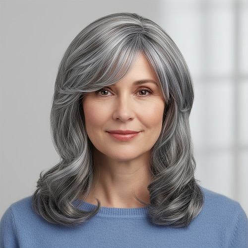 parrucche grigio argento per donna, capelli ondulati lunghi fino alle spalle con frangia laterale, parrucca sintetica resistente al calore dall'aspetto naturale per l'uso quotidiano, feste