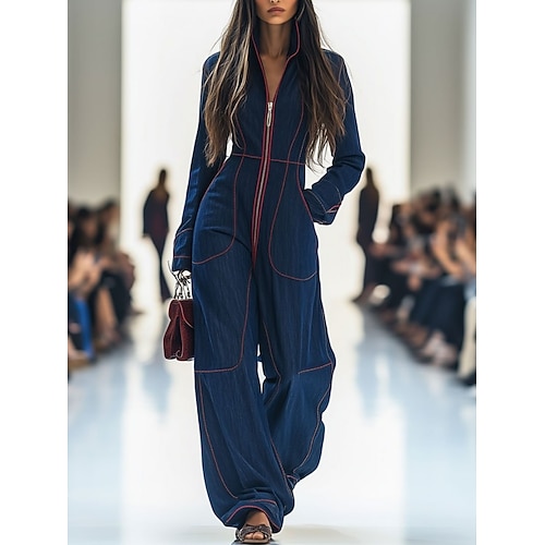 Per donna Normale Tuta Attivo Tinta unica Manica Lunga Gamba larga Scollo a V Tasca Vita alta Vacanza Quotidiano Vestibilità regolare Blu Primavera