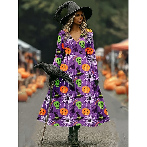 Abito midi Halloween da donna con stampa strega abito casual modello ad A vacanza abbigliamento casual matrimonio festa compleanno vestibilità regolare grafica maniche lunghe collo a V nero viola
