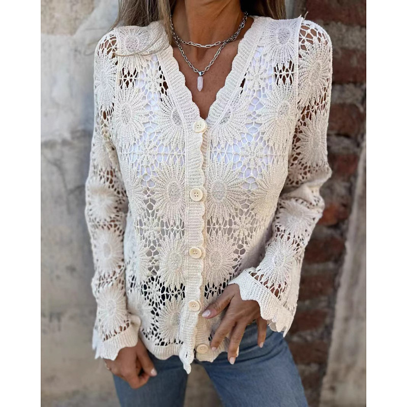 Women's Blouse Lace Tops Plain Active Casual Long Sleeve V Neck Regular Tops Daily Holiday Going out Lace Patchwork Buttons Black White Apricot Spring Fall