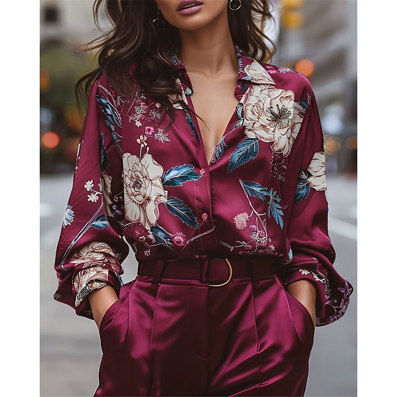 Women's Shirt Elegant Satin Summer Tops Floral Graphic Plain Elegant Vintage Ladies Long Sleeve Shirt Collar Regular Tops Daily Work Holiday Ruched Patchwork Buttons Wine Summer Spring