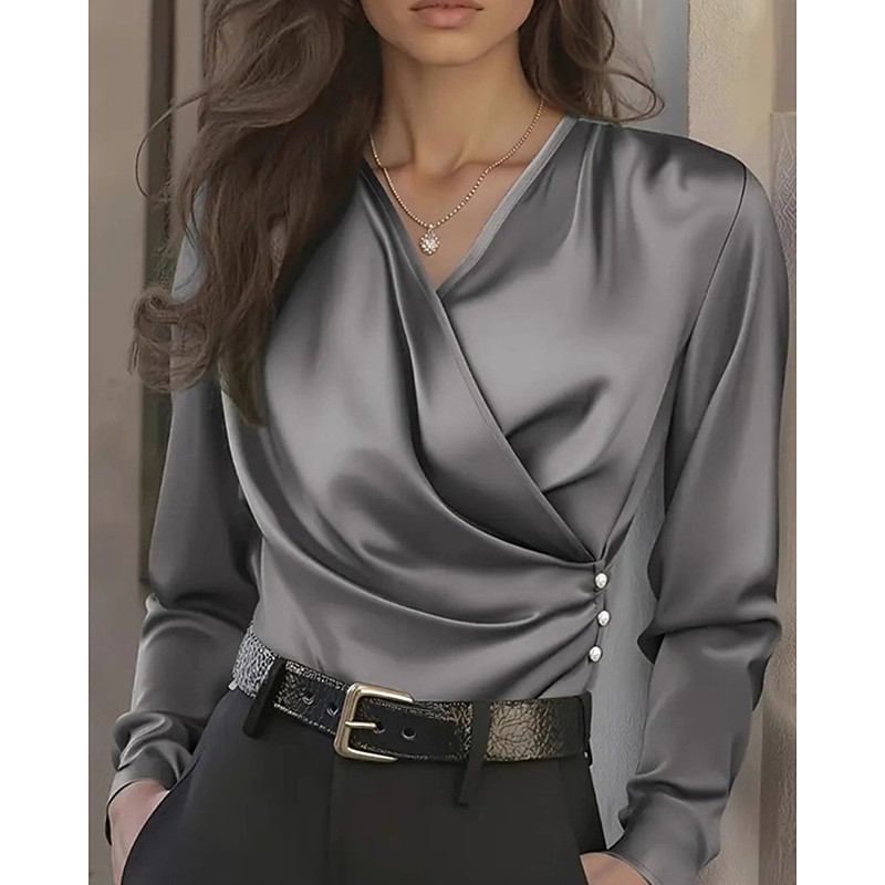 Women's Blouse Dressy Tops Solid Color Plain Elegant Ladies Stylish Long Sleeve V Neck Regular Tops Daily Work Holiday Ruched Patchwork Beaded Black White Gray Spring Fall