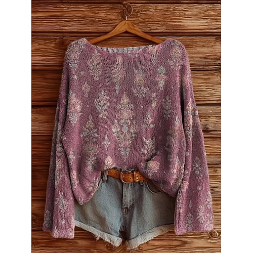 maglione da donna casual morbido floreale vintage etnico manica lunga girocollo top normale quotidiano festa stampa vino rosso viola fucsia primavera autunno inverno