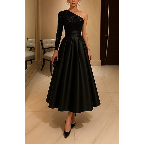 Linea ad A Lunghezza Tè Abiti da Cocktail Abiti da festa Elegante Manica Lunga Monospalla Festa in giardino Matrimonio Raso Con Paillettes con Pieghe Paillettes