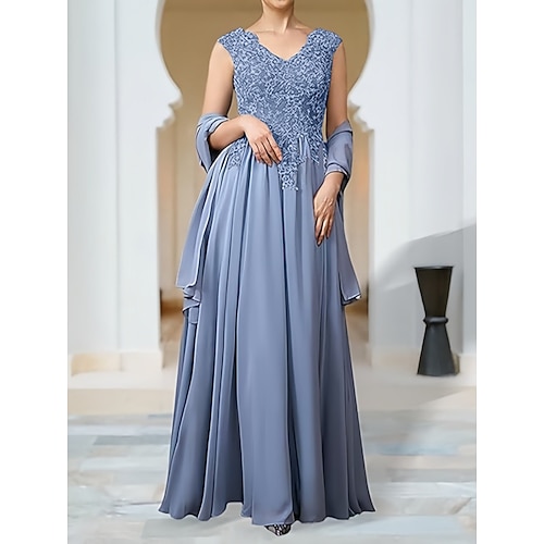 Abiti per invitati al matrimonio A-Line Abito elegante invitato al matrimonio fidanzamento lungo fino al pavimento senza maniche scollo a V chiffon con applicazioni scialle