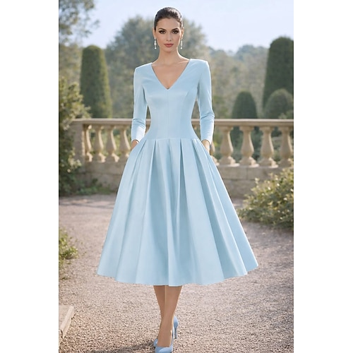 Linea ad A Lunghezza Tè Abiti da Cocktail Elegante Quotidiano Abiti semi formali Manica 3/4 Scollo a V Festa in giardino Matrimonio Raso con Pieghe