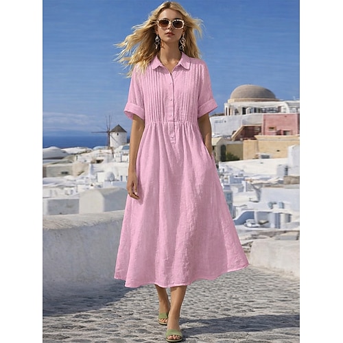 abito midi da donna in cotone e lino, abito chemisier, abito caftano, moda, moderno, quotidiano, all'aperto, vacanza, vestibilità regolare, semplice, manica corta, colletto della camicia, blu, bianco, rosa, rosso, estate, primavera