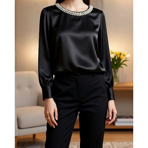 Per donna Blusa Top Eleganti Tinta unica Semplice Elegante Signore Lussuoso Manica Lunga Girocollo Top Regolari Quotidiano Lavoro Uscire Arricciato Patchwork Con perline Nero Bianco Verde Albicocca
