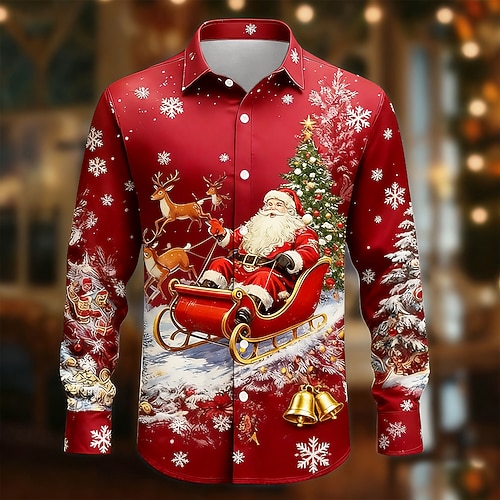 Weihnachten Herren Weihnachtsmann Schneeflocke Schlitten Hemd Knopfhemd Langarm Lustig Weihnachtsgeschenke Ferien Frühling Herbst Umlegekragen 3D-Druck Hemden mit Kragen Blau 1# Rote Blau