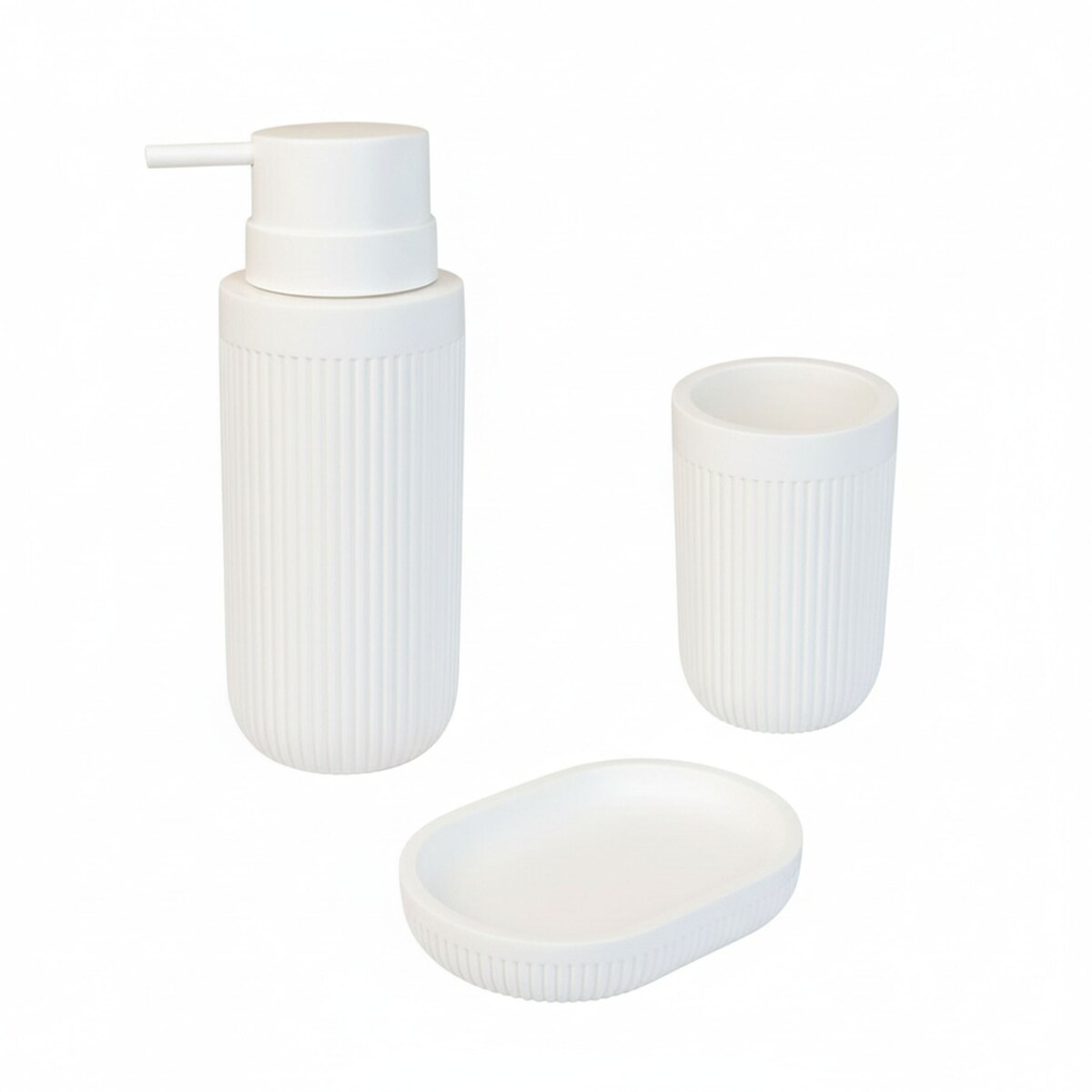 Relaxdays Bad Accessoires, 3-teilig, Seifenschale, Seifenspender, Zahnputzbecher, Polyresin, Bad Zubehör Set, weiß