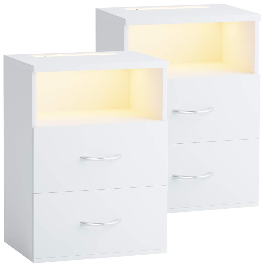 Hvite nattbordsett med 2 stk. med LED-belysning og USB-port