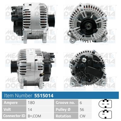 Laturi 14V 180A Meat & doria 5515014 - audi a6 allroad c6, a6 c6, a6 c6 avant, a8 d3, q7, vw touareg - OE 059 903 015R, 059 903 015RX