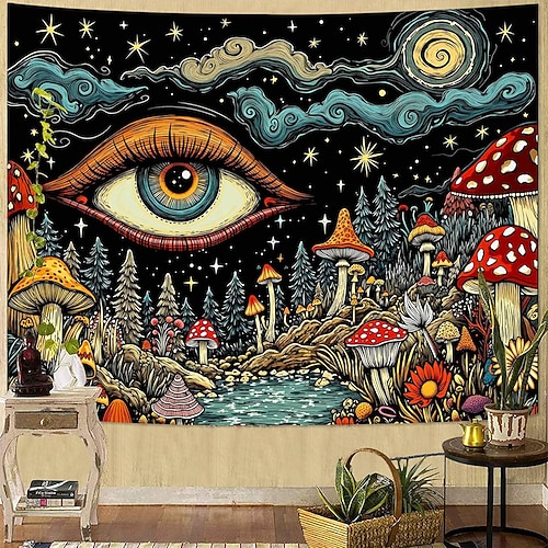 Arazzo psichedelico con funghi, occhio psichedelico, arazzo da parete, notte stellata, galassia, foresta, paesaggio, arte murale per sala yoga, spazio di meditazione, arredamento per camera da letto