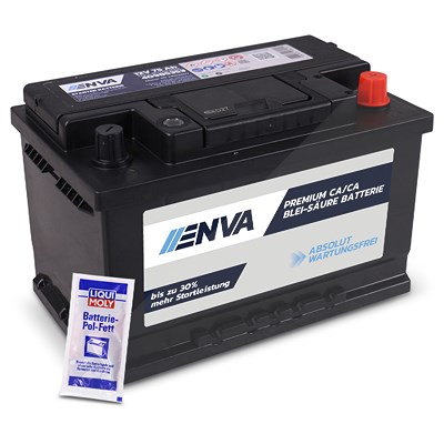 Enva Autobatterie, Starterbatterie 12V 75Ah 660A + 10g Pol-Fett [Hersteller-Nr. 40985529] für Audi, Maserati, Chrysler, Rover, Nissan, Opel, Land Rove