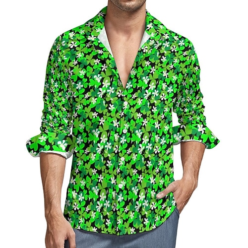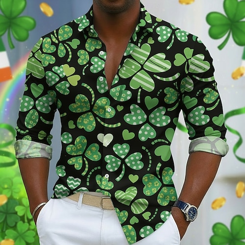 maglietta di San Patrizio per uomo - trifoglio fortunato Top a maniche lunghe con stampa 3D a trifoglio e colletto con revers, grafica irlandese, per la festa di San Patrizio