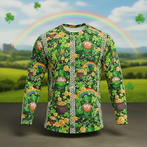 T-shirt a maniche lunghe per uomo per il giorno di San Patrizio, maglietta grafica con trifoglio irlandese fortunato, scollo rotondo con stampa 3D, top per il giorno di San Patrizio