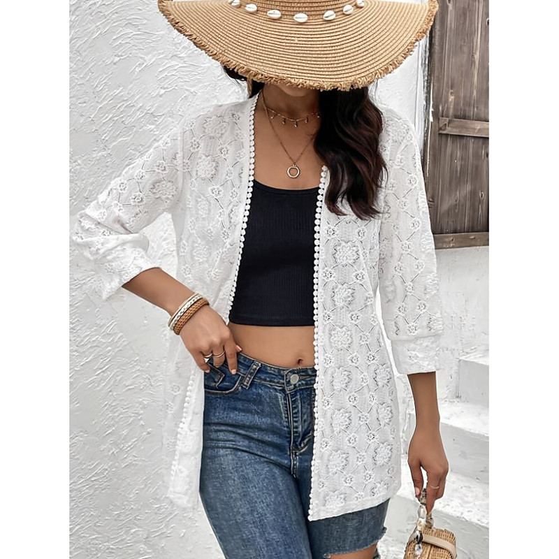 Women's Casual Jacket Outdoor Lace Solid Color Windproof Fashion Regular Fit Outerwear 3/4 Length Sleeve Fall White S
