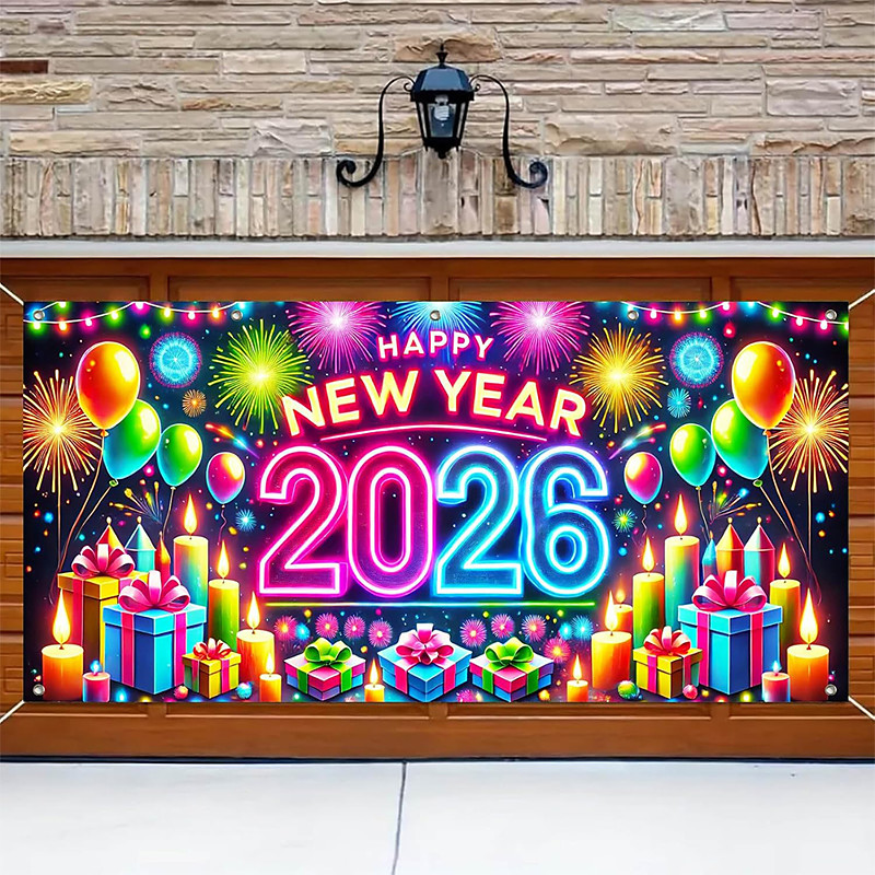 New Year Tapestry Garage Door Cover Large Hanging Backdrop Happy New Year 2026 Cute 3D Party Outdoor Holiday Shooting Backgrounds Yard Home Decor