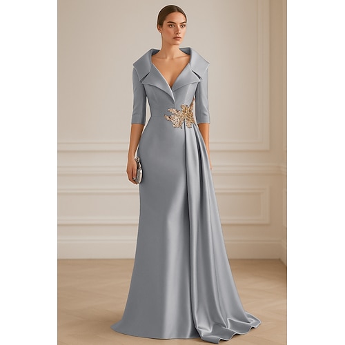 Abito da sera A-Line con perline e ricami Abito da madre della sposa Abito formale Elegante abito da matrimonio lungo fino al pavimento con maniche a metà colletto a camicia in satin con spacco