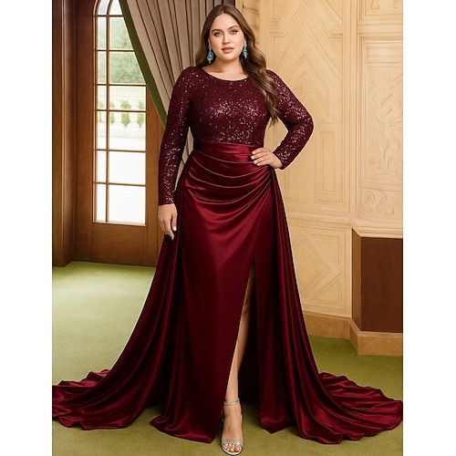 Abito a-line lungo fino al pavimento abito da sposa abiti formali abito da sera abito madre della sposa maniche lunghe scollo tondo elegante vintage festa satinato con pieghe paillettes spacco