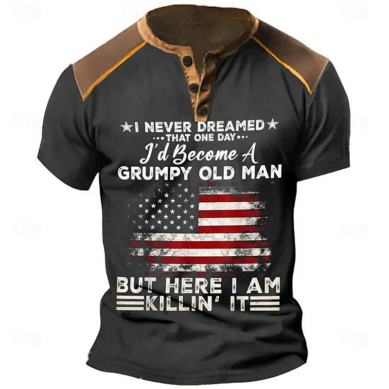 Men's Grumpy Old Man Funny Henley T-Shirt with Distressed American Flag Print. Short Sleeve Humorous Gift for Dad, Grandpa, Patriotic Men.