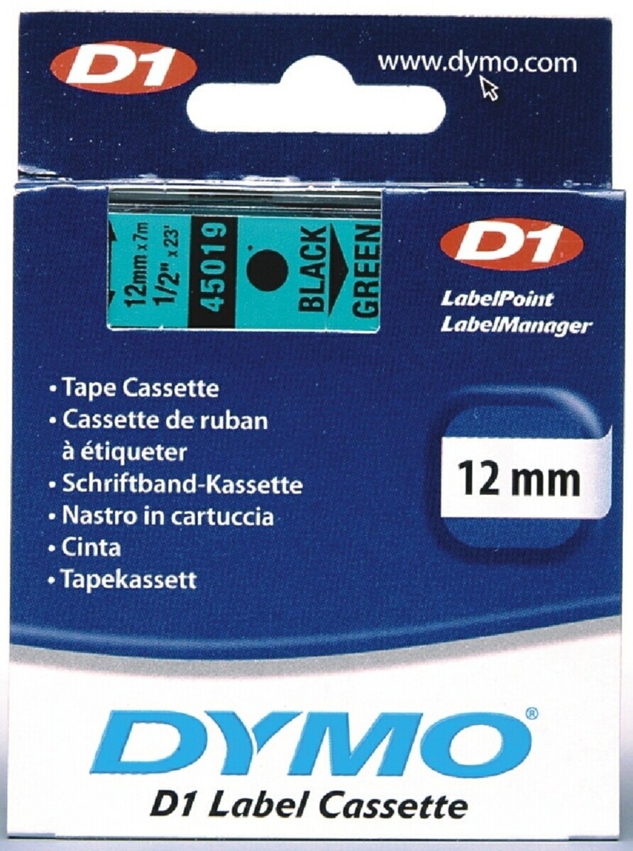 Dymo 45019 D1 12mm x 7m Black on Green Tape