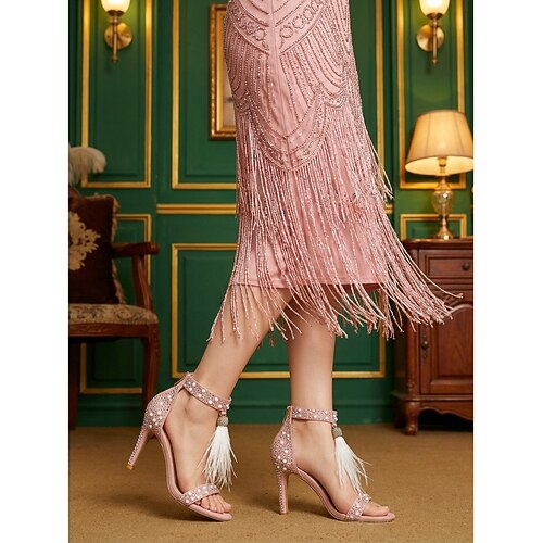 Elegante cremefarbene Stiletto-Sandalen im Stil der 1920er Jahre, verziert mit funkelnden Strasssteinen und Perlen Quastenfedern für Vintage-Hochzeiten und formelle Galas Themenpartys
