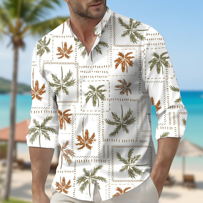 Men's Coconut Tree Grid / Plaid Patterns Tropical Plants Shirt Hawaiian Shirt Stand Collar Shirt Long Sleeve Hawaiian Vacation Holiday Spring Fall Mandarin Collar Band Collar 3D Print Button Up Shirts