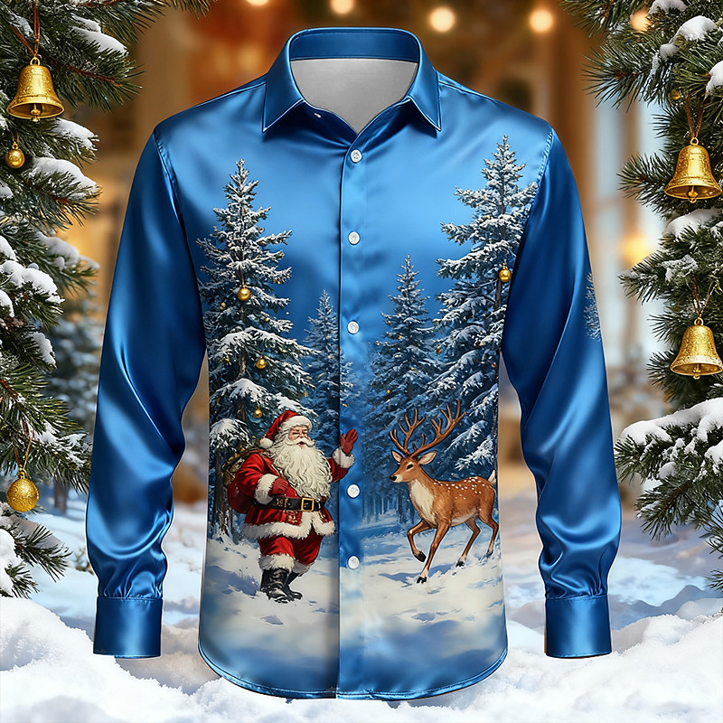 Christmas Men's Santa Claus Christmas Tree Reindeer Shirt Satin Shirt Dress Shirt Long Sleeve Fashion Casual Outdoor Party Holiday Spring Fall Turndown 3D Print Button Up Shirts Light Blue Blue 3