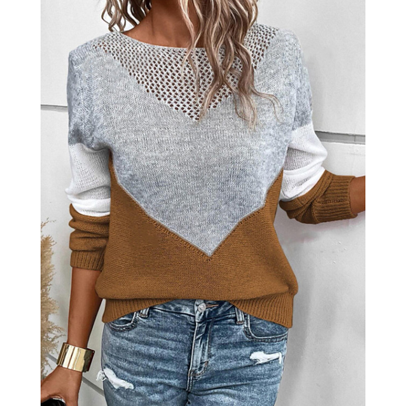 Women's Sweater Pullover Streetwear Casual Color Block Crew Neck Patchwork Hollow Out Knitted Long Sleeve Regular Tops Knit Daily Holiday Going out Black Yellow Fall Winter