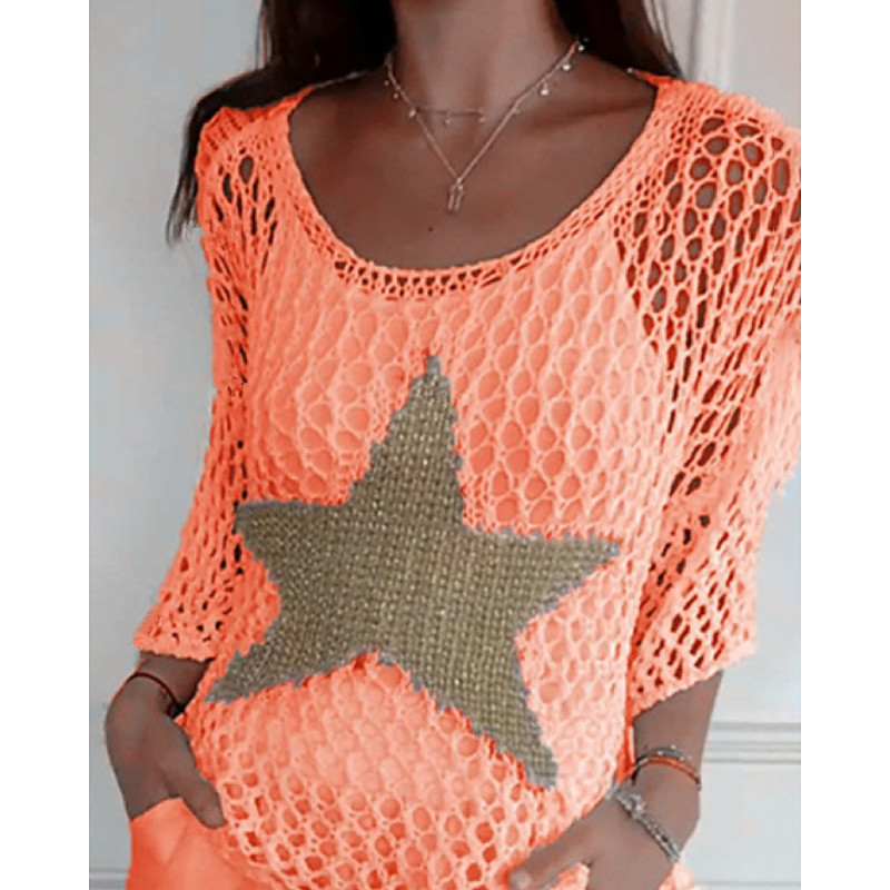 Women's Sweater Pullover Streetwear Casual Geometric Crew Neck Hollow Out Knitted Print 3/4 Length Sleeve Regular Tops Knit Outdoor Daily Holiday White Pink Summer Spring