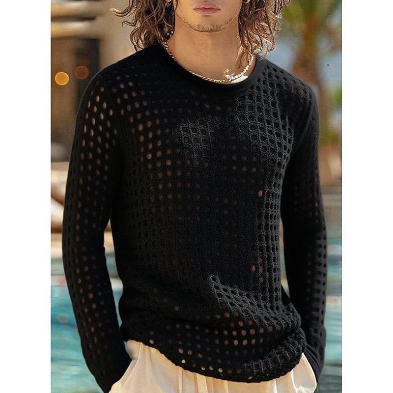 Men's Tee Top Long Sleeve Shirt Long Sleeve Crew Neck Summer Spring Solid Color Mesh Daily Casual Street Style Hollow Out Outdoor Street Causal White Black Top Tee for Men