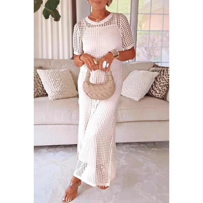 Women's Dress Set Sundress Shift Dress Tulle Dress Elegant Casual Plain Hollow Out Midi Dress Short Sleeve Crew Neck Outdoor Beach White Navy Blue Purple Summer Spring Regular Fit