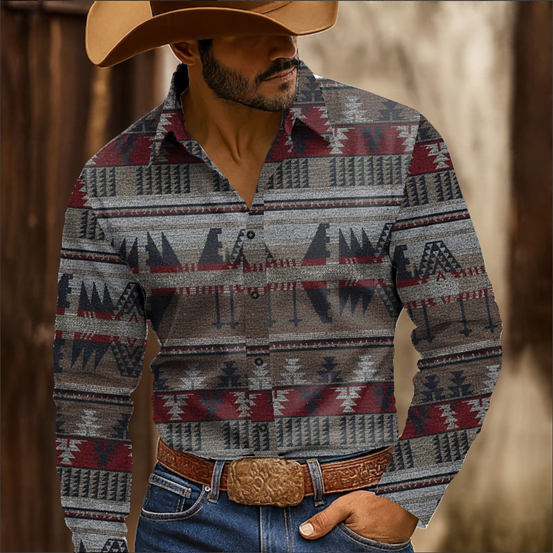 Men's Geometric Indian Culture Navajo Pattern Shirt Western Shirt Button Up Shirt Long Sleeve Vintage Retro Outdoor Casual WorkWear Spring Fall Turndown 3D Print Collared Shirts Blue Dark Red Green