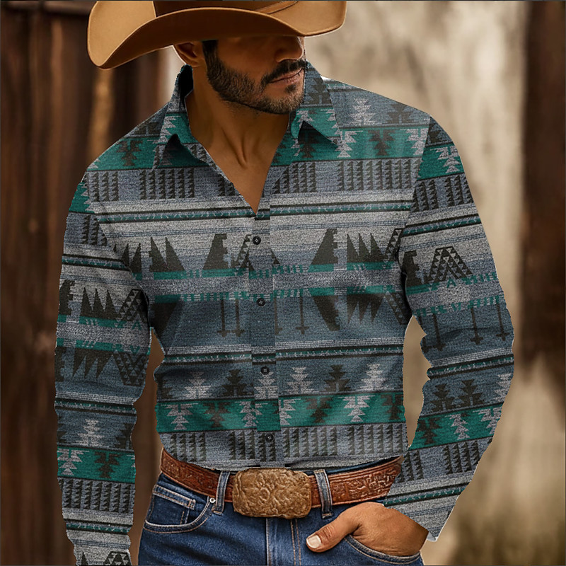 Men's Geometric Pattern Ethnic Indian Culture Shirt Western Shirt Cowboy Shirt Long Sleeve Vintage Retro Outdoor Casual WorkWear Spring Fall Turndown 3D Print Button Up Shirts Blue Wine Green